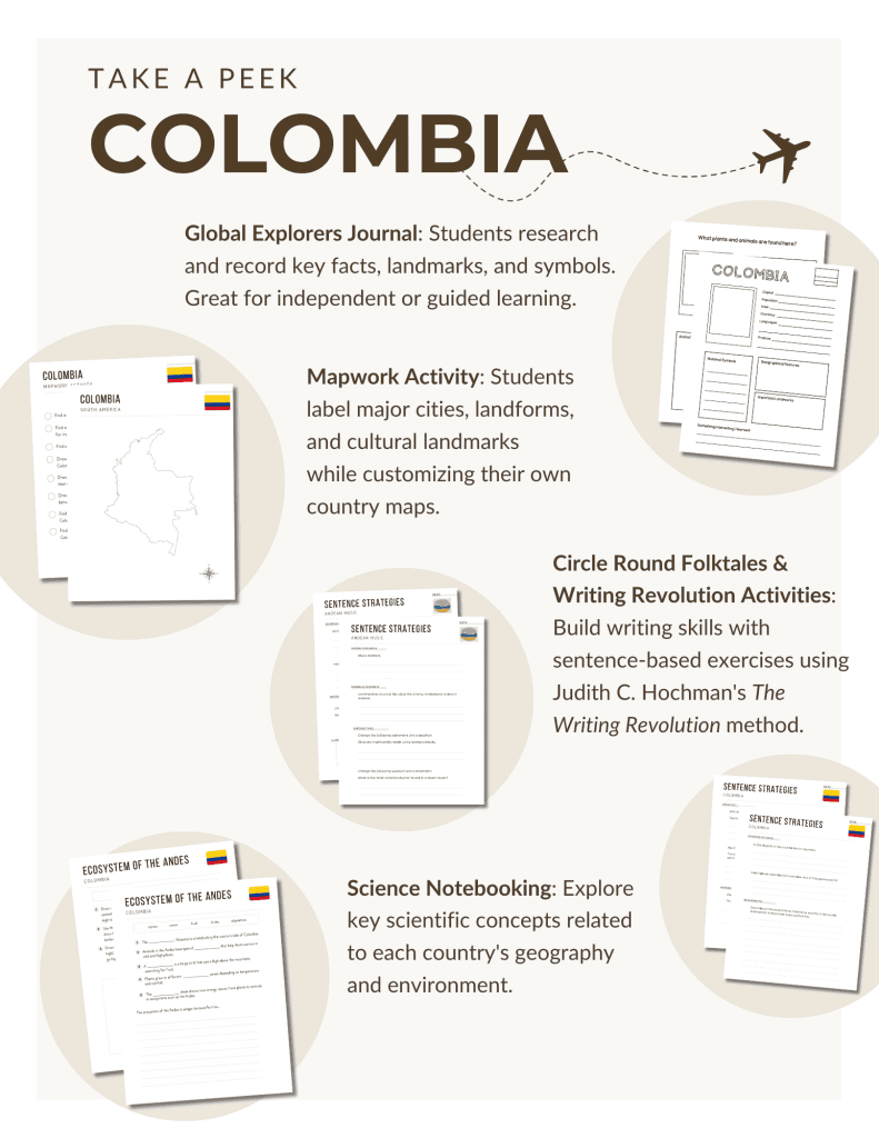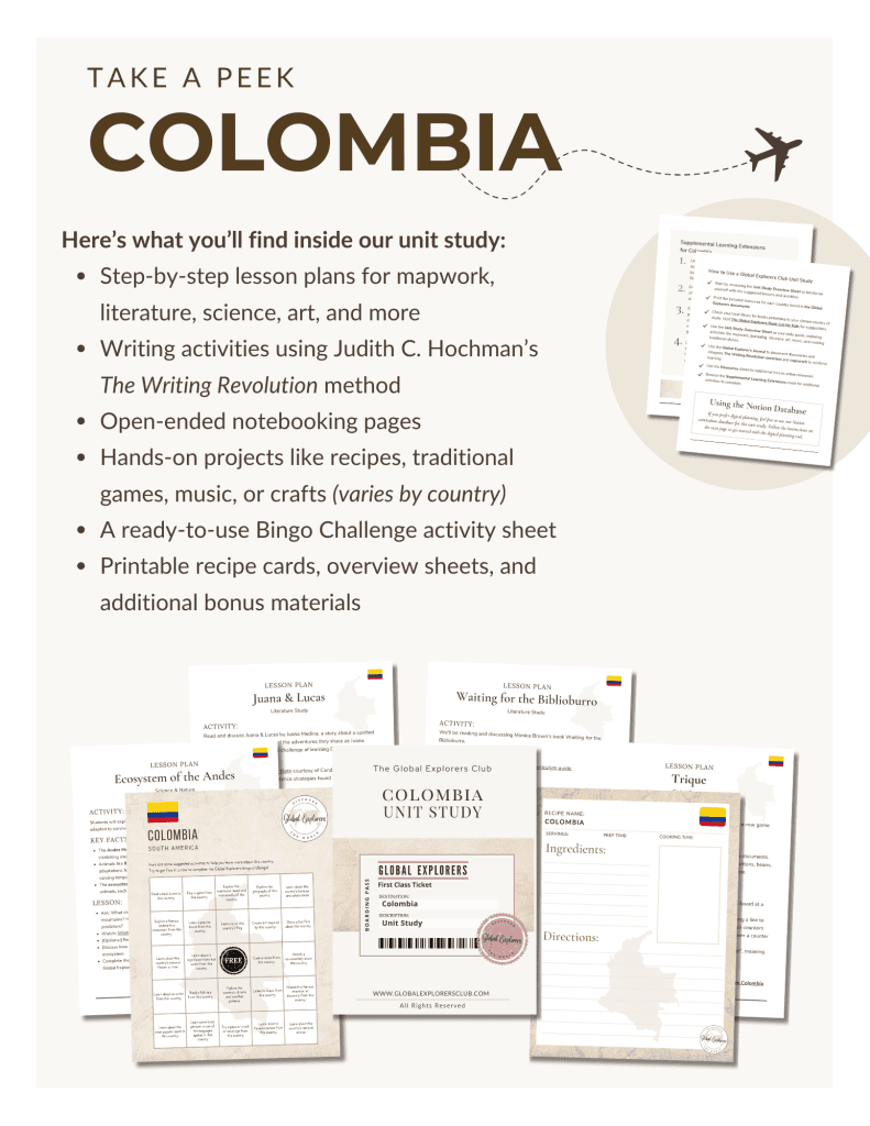 Our Colombia unit study is designed for both homeschool families and classroom educators. Whether you’re supplementing your social studies curriculum or building a full geography unit, this resource encourages students to discover a world of learning through a variety of stories, lessons, and hands-on activities.