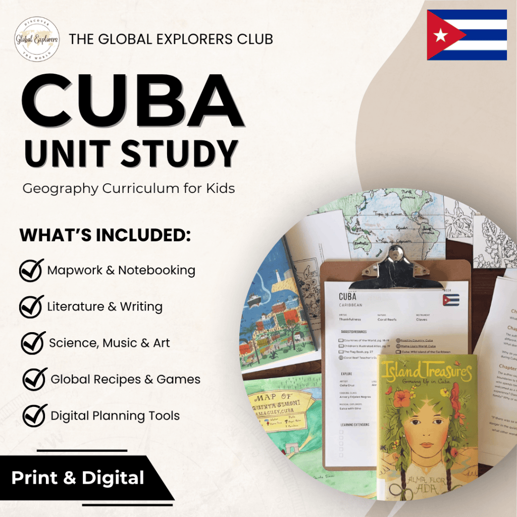 Literature-based Cuba unit study, part of the Global Explorers Club's homeschool geography curriculum featuring hands-on cultural activities for kids