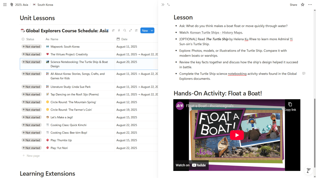 The Notion calendar view lets you drag, drop, and customize your schedule. In this example, I’ve planned our South Korea unit over two weeks. I can easily make changes if needed, though. Some lessons, like Tap Dancing on the Roof: Sijo are scheduled over the course of the two weeks, as we’ll read a few of the poems every day.