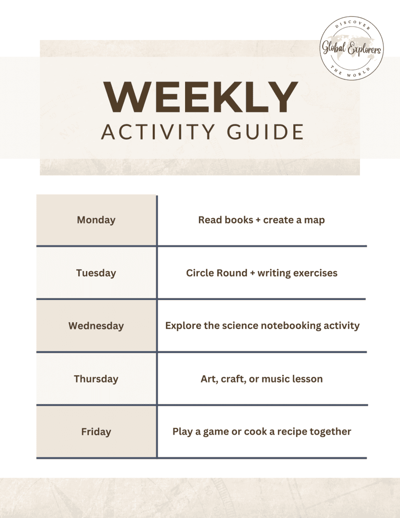 Here are two sample weeks to help you see how you might structure your Global Explorers lessons. Mix and match activities to fit your schedule. There’s no “right” way to do it!