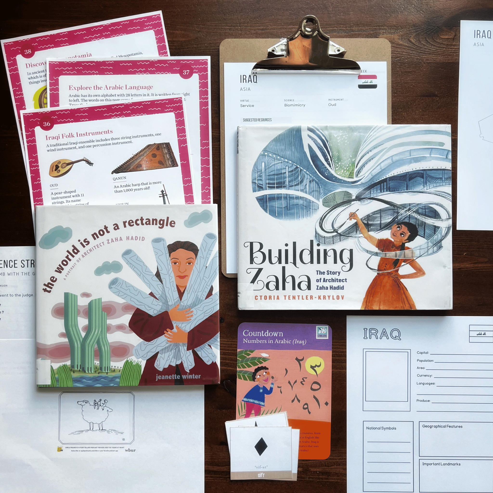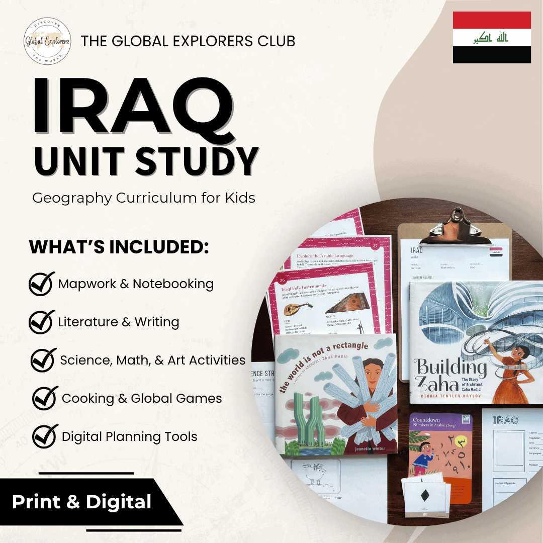 Iraq Unit Study, part of the Global Explorers Club's literature-based geography curriculum with cultural activities for kids, including The Writing Revolution resources, Circle Round folk tales, mapwork and geography, and books like The Librarian of Basra and Building Zaha: The Story of Architect Zaha Hadid