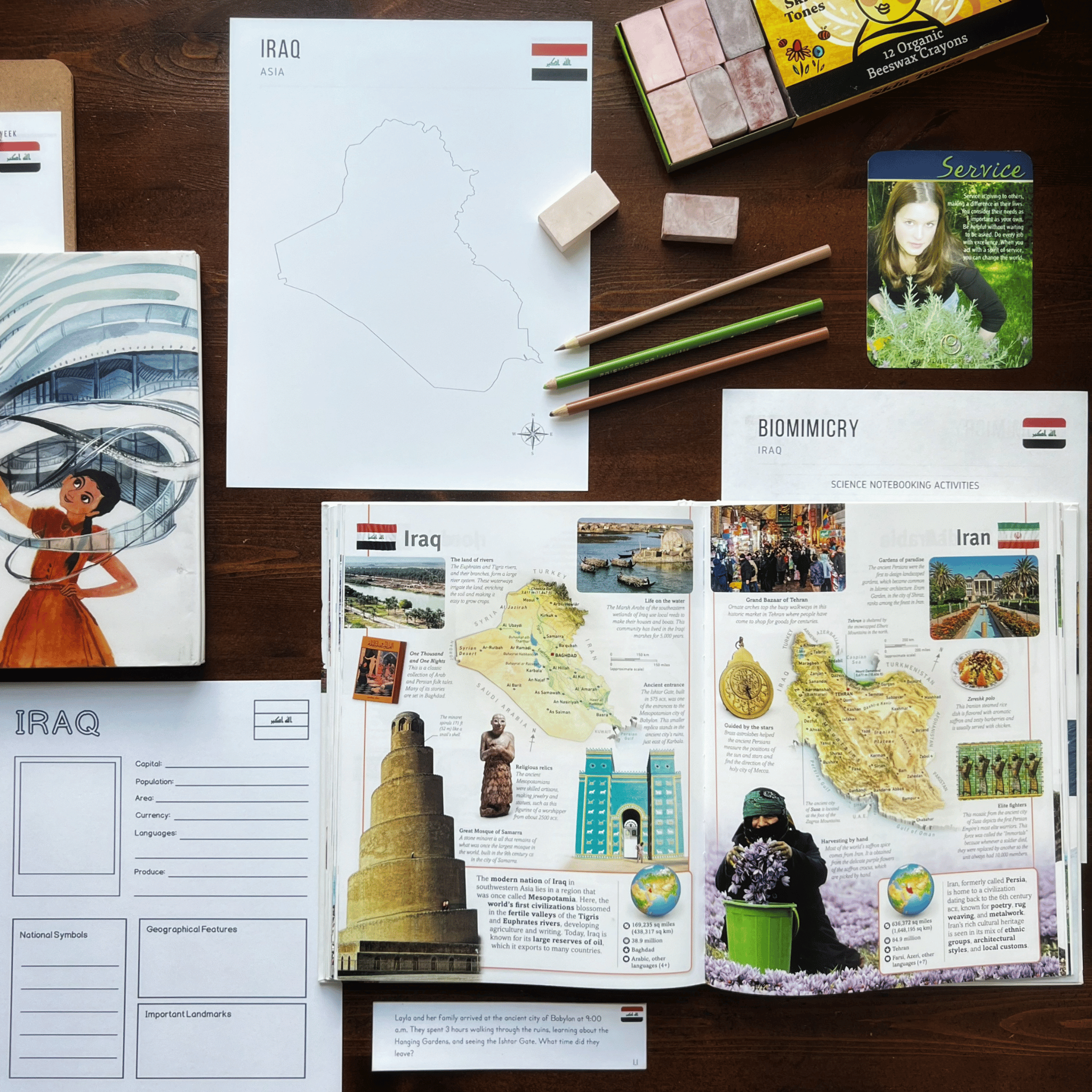 Explore Iraq through geography, literature, science, art, and hands-on learning activities with our ready-to-use printables and an optional digital planning tool.