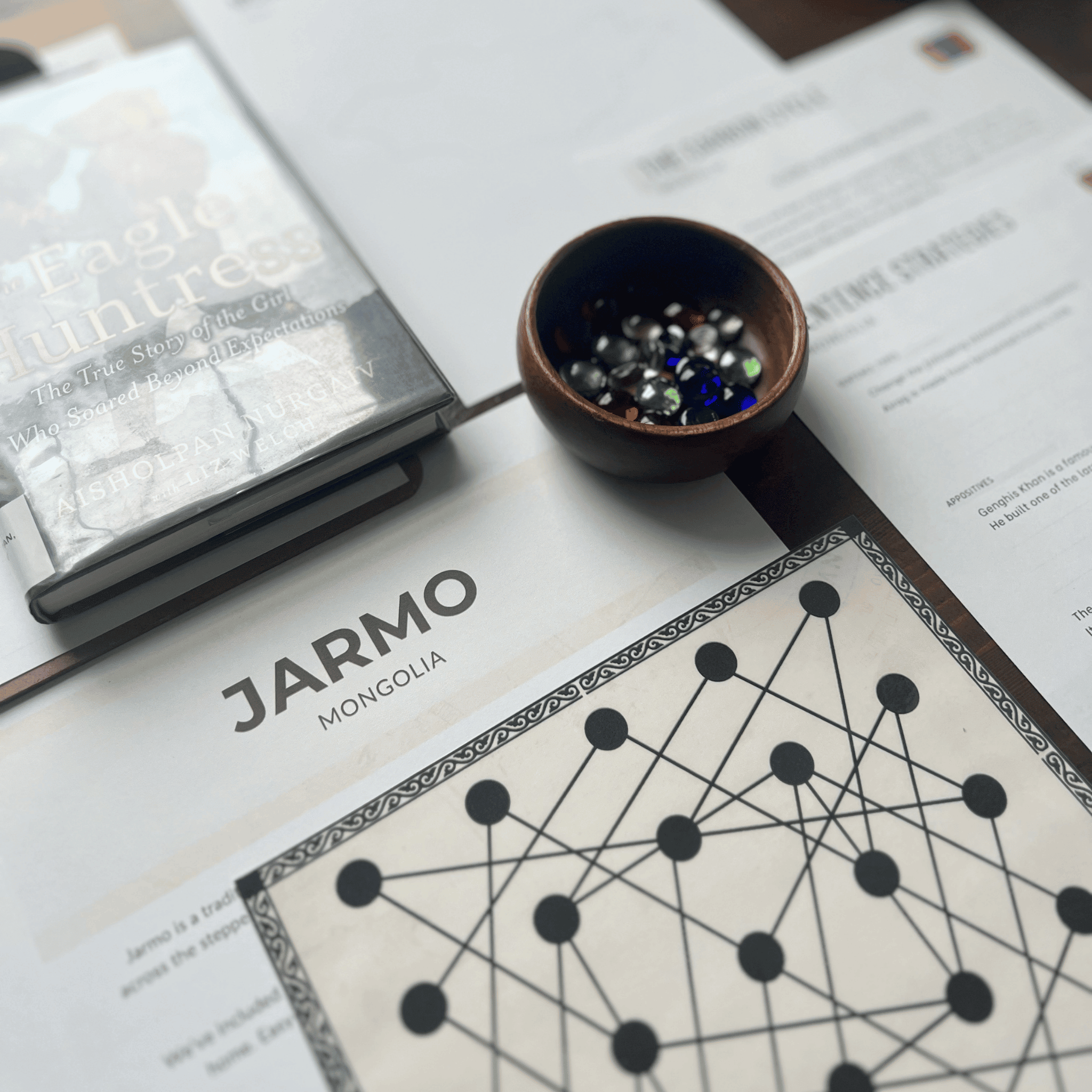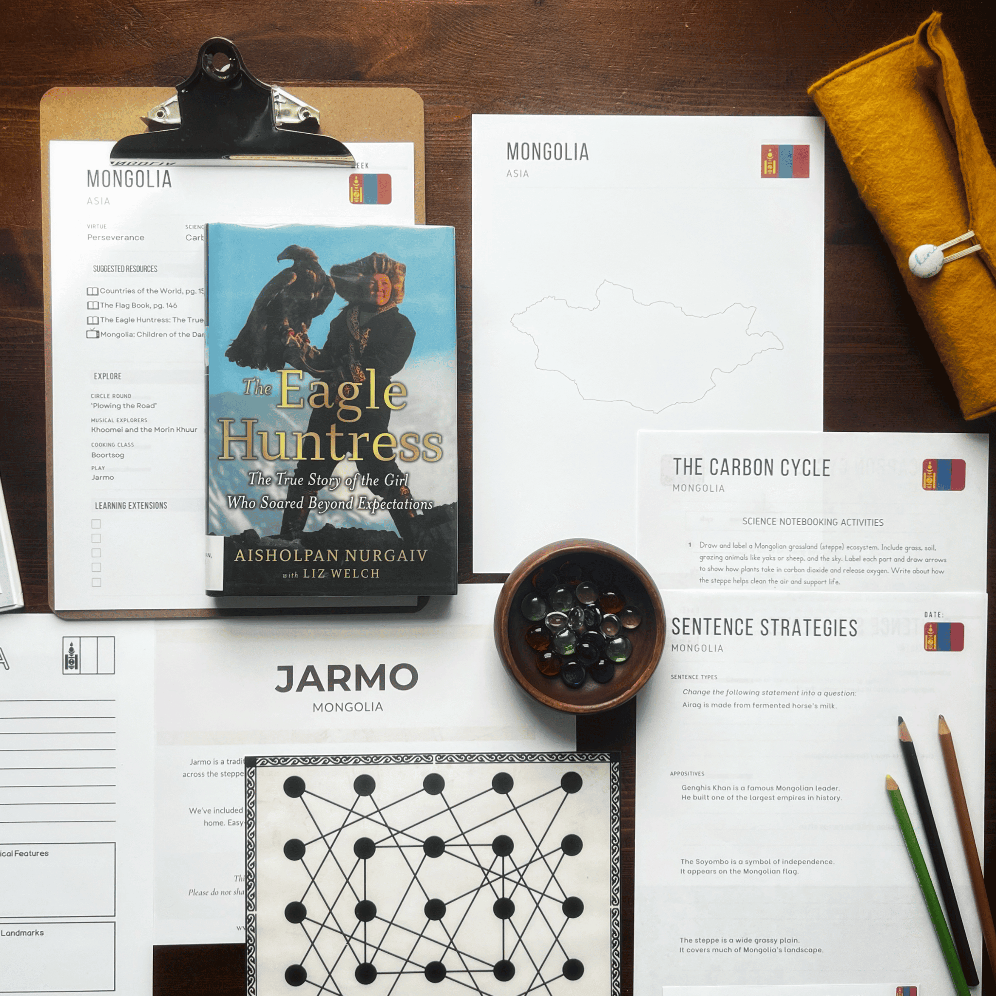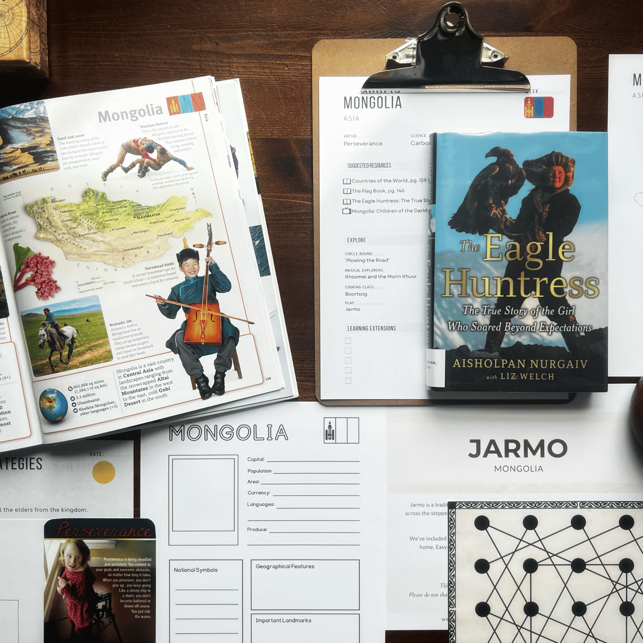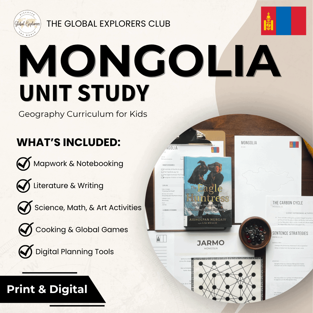 Explore the culture, geography, and traditions of Mongolia with our hands-on, secular country unit study. Read The Eagle Huntress: The True Story of the Girl Who Soared Beyond Expectations, study grassland ecosystems and the carbon cycle, and explore Mongolia’s geography and landmarks through mapwork and notebooking activities. Discover the science and artistry of yurt design, listen to the sounds of Khoomei and the morin khuur, and explore character education through the virtue of perseverance. You’ll also make boortsog and learn how to play Jarmo, a centuries-old Mongolian board game.
