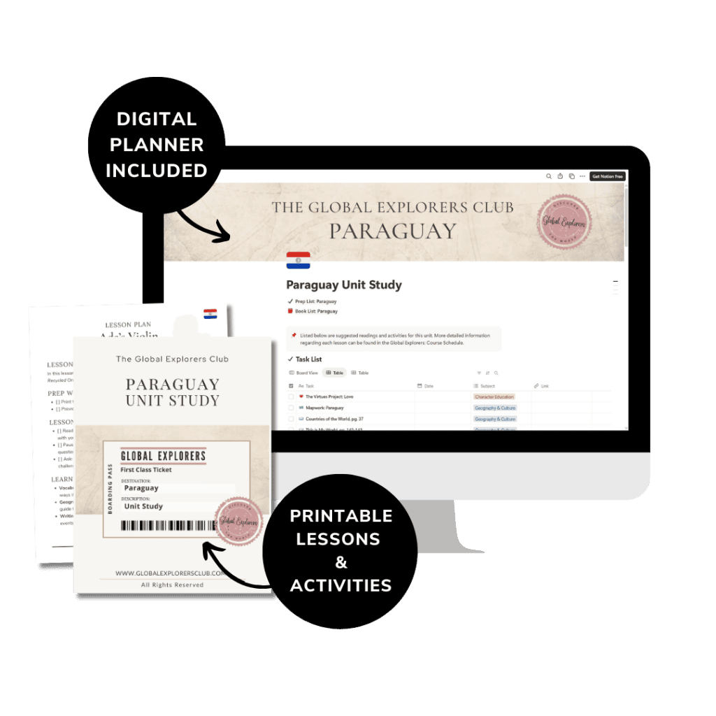 Along with your core activities, you’ll receive a collection of extras to support flexible learning, including our Paraguay unit study overview sheet, a country-specific Global Explorers cookbook page, our Discover Paraguay: Bingo Challenge activity, and much more. You’ll also get access to our optional Notion digital planning tool to help keep your lessons organized and easy to navigate.