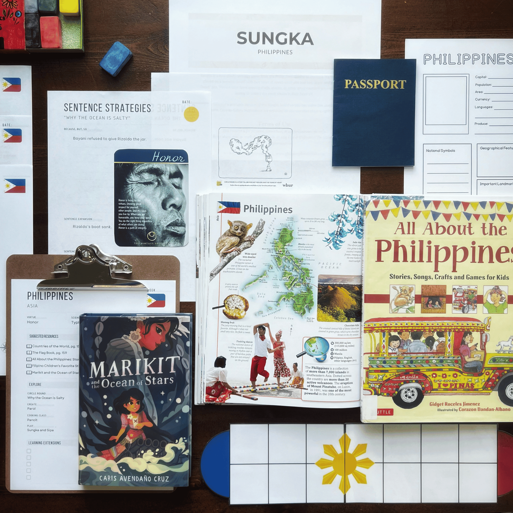 Explore the culture, geography, and traditions of the Philippines with our hands-on, secular country unit study. Read the middle-grade novel Marikit and the Ocean of Stars, explore storm science with a typhoon-focused notebooking page, and learn about folk dances, storytelling, and Filipino holiday traditions. You’ll also reflect on the virtue of honor, create a parol, try your hand at a couple traditional games, and cook pancit.