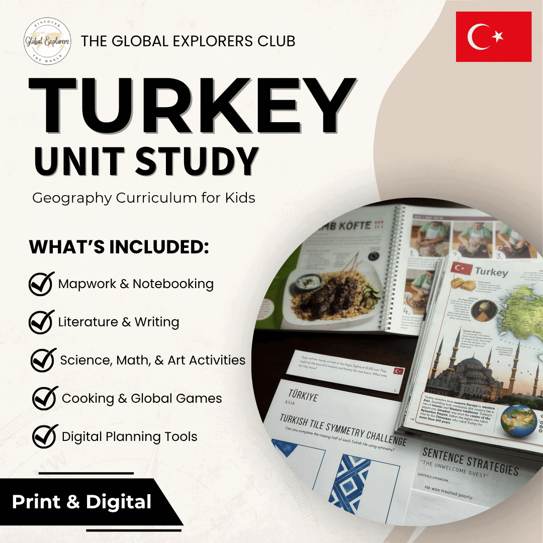 Explore Turkey through geography, literature, science, art, and hands-on learning activities with our ready-to-use printables and an optional digital planning tool.