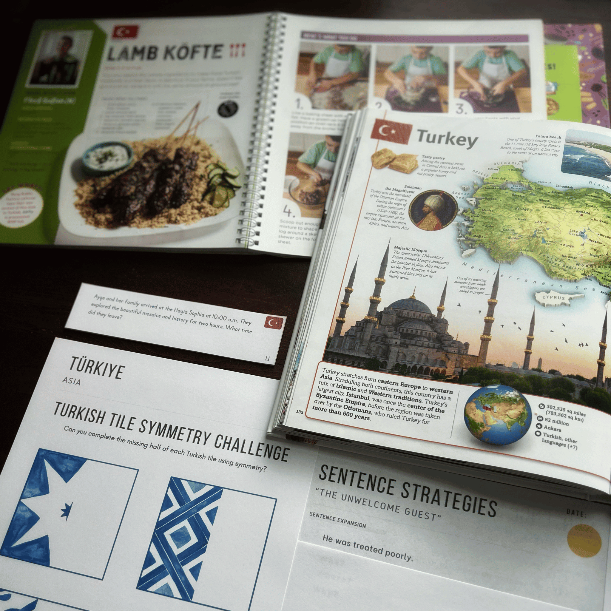 Explore the culture, geography, and traditions of Turkey with our hands-on, secular country unit study. Meet Nasreddine, a beloved figure from Turkish folklore, paint colorful Turkish tile designs, experiment with Ebru paper marbling, and learn how to make traditional recipes like apple tea and lamb köfte. You’ll also learn about tectonic plates, explore Islamic geometric patterns, and work through guided writing activities that explore Turkish stories and traditions.